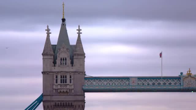 A stationary shot of one the towers of Tower Bridge in London. Next to it, on the right, the British flag is waving. Filmed on an overcast day, October 10, 2011.