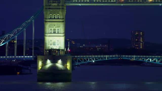 A panning shot - from left to right - of lit Tower Bridge in the evening. There is traffic on the bridge and boats in the water as well as buildings in the background. Filmed on October 10, 2011.