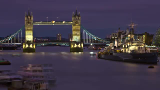 A stationary time-lapse of Tower Bridge in London. Buildings and cityscape in the background, traffic on the bridge and boats on the river. The shot starts at sunset with pinkish colors and then it gets darker gradually and the bridge and boats light up. Filmed in October 2011.