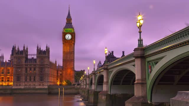 Time-lapse of Big Ben at nightfall. The streetlights, clock face, and Palace of Westminster are illuminated as time passes. Blurred movements of people are seen on the Westminster Bridge and clouds pass by overhead and turn purple. Filmed in October 2011.