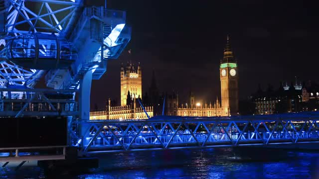 Time-lapse of Big Ben and the Houses of Parliament at night with the London Eye ferris wheel, illuminated with blue light, in the foreground. Filmed in October 2011.
