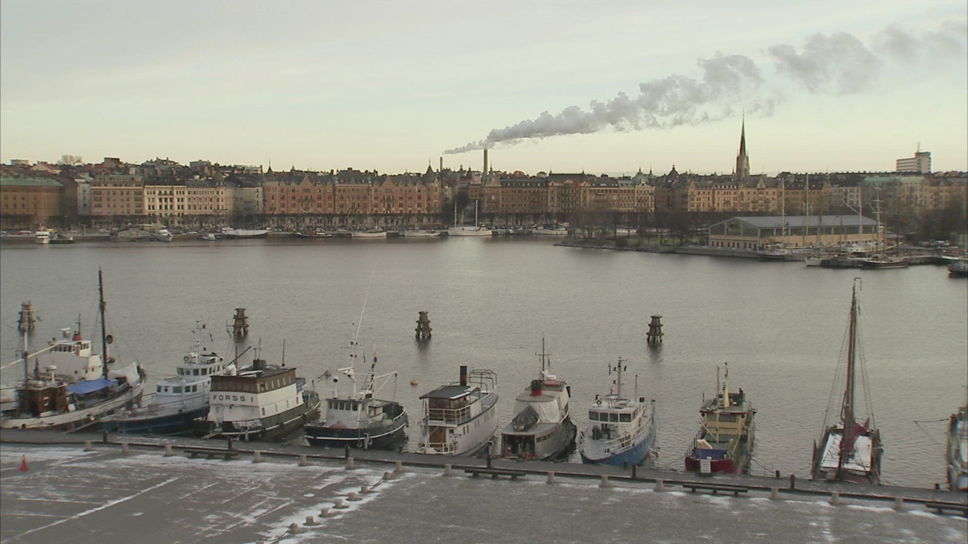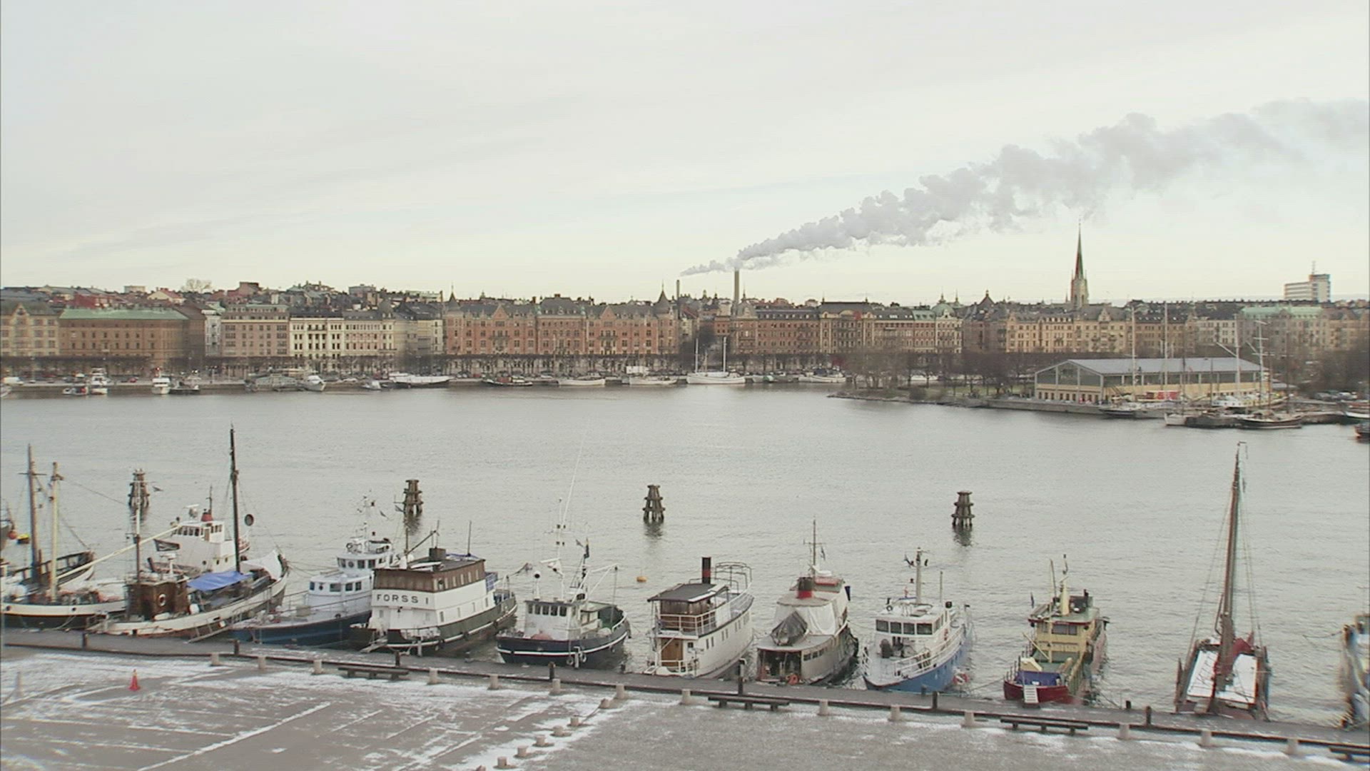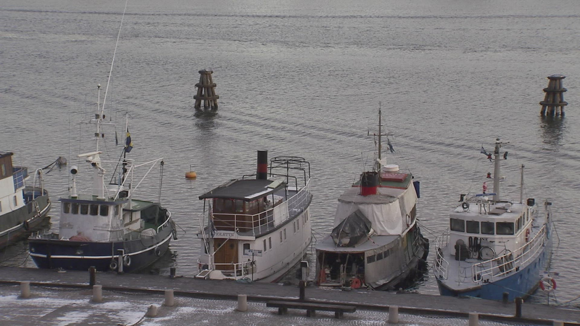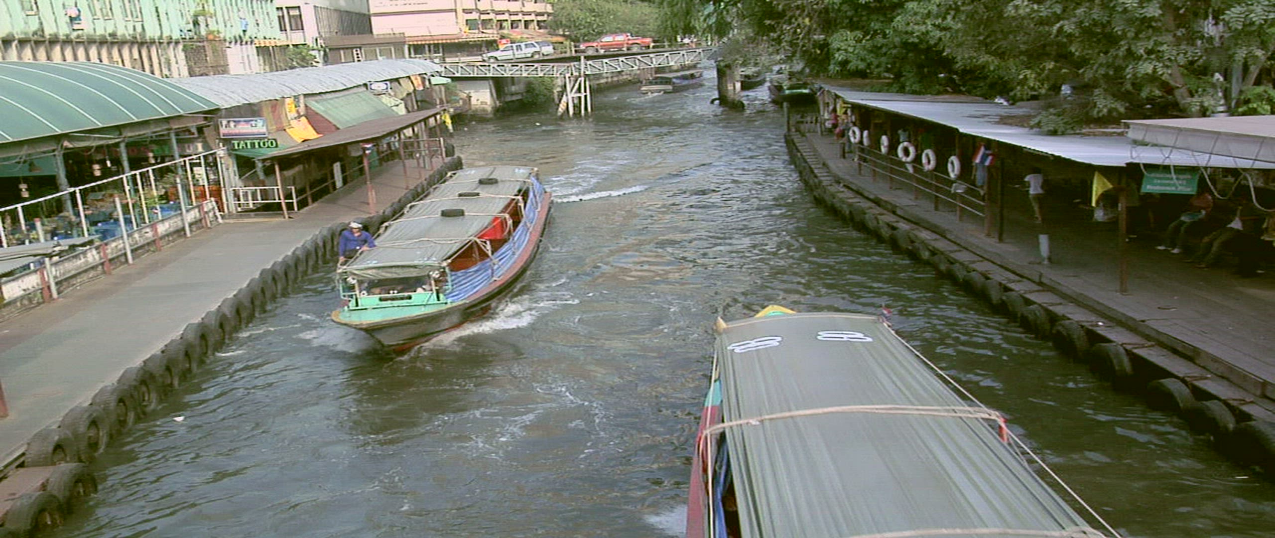 A stationary shot of a boat and gondolas passing by the camera on a canal in Venice. Some gondolas are floating empty in the background near the houses. Captured on May 1, 2012.