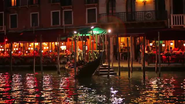 Stationary shot of a gondola at night with lights in the background