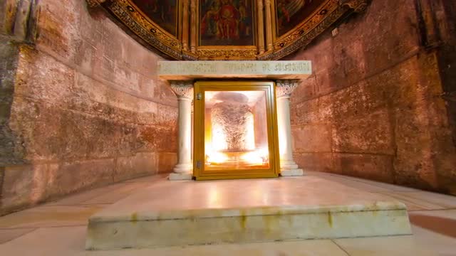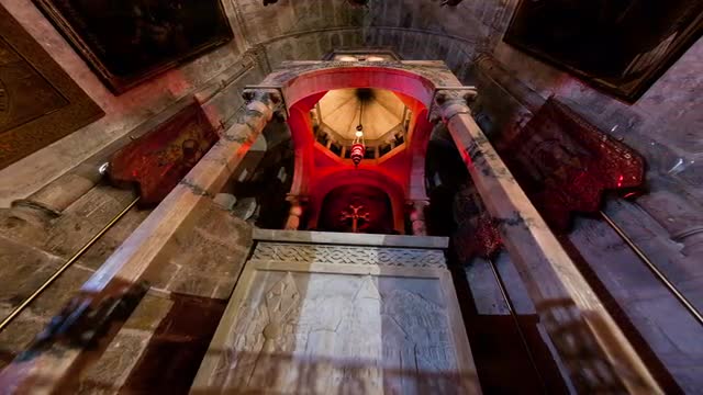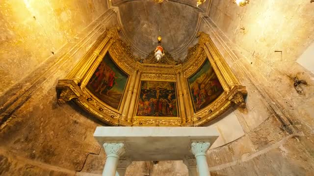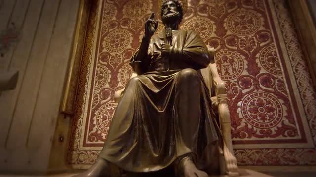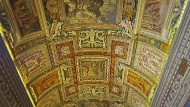 Low-angle tracking footage of the ornate frescoes and crown molding gracing the ceiling of the Gallery of Maps within the Vatican Museums.