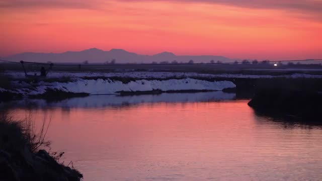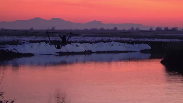 A stationary shot of river Thames, Westminster Bridge, Big Ben clock tower and Westminster Palace at dusk. The light and clouds create a dramatic effect. There is a person on the bridge. Filmed on October 9, 2011.
