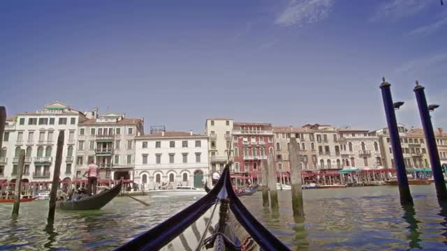 Traveling view from the front of a gondola gliding under a bridge and across the Grand Canal, buildings along the edge of water in distance, shot in slow motion on May 2, 2010 in Venice.