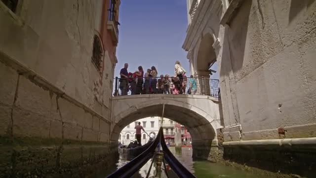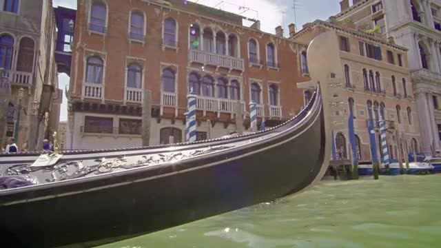 A stationary shot of boats and gondolas on a canal near the Santa Maria della Salute church in Venice, Italy. Waterfront buildings and the entrance to the Grand Canal also seen. Captured on a cloudy day on May 2, 2012.