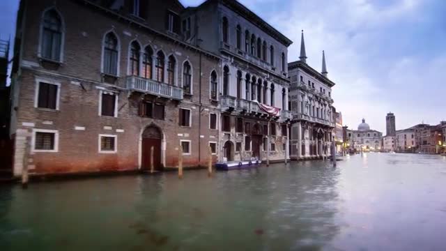 Tracking shot of the Grand Canal at dusk. The waterside buildings are old and ornate with much detail, but have no lights on, creating a dark shot. Shot on May 2, 2012 in Venice, Italy.