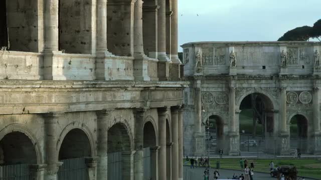 > Panning shot close up of Colosseum to Arch of Constantine