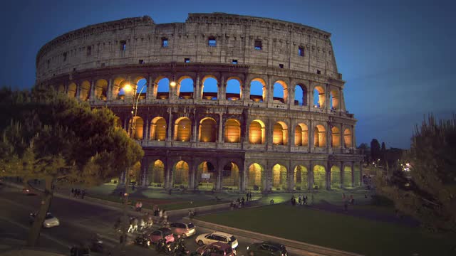 Footage of a busy intersection near the Colosseum. The Forum is illuminated for the night. Filmed in Rome, Italy on May 6, 2012.
