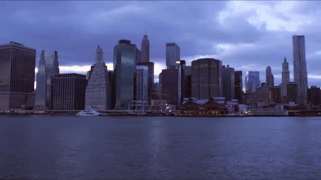 Moving shot, crossing an intersection between four skyscrapers. California