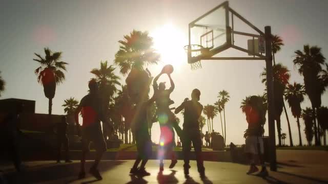 Lens flare shot of basketball game near Venice Beach, California filmed at varying speeds. The shot shifts from timelapse to slow motion to timelapse again. This was taken at dusk at Ocean Front Walk in June 2012.