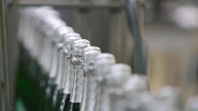 Kiev, Ukraine - May 2017: Champagne Manufactory. Bottles of green color move along conveyor at a factory of champagne wines, close-up. Bottle of champagne is sealed with aluminum foil in factory.