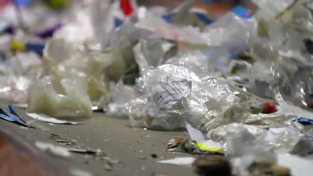 Pallastic wastes prepared for recycling. Warehouse with recyclable materials at the garbage processing factory. Environment protection concept.