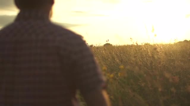 Slow motion shot of a cowboy riding a horse. This shot was taken at sunset on an open field with a mountain range in the background.