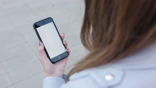 A young lady walking and using a smartphone outdoors. Medium Dolly shot.