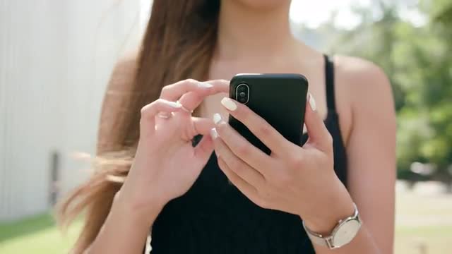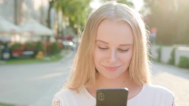 A young beautiful lady using a smartphone near the brick building. Medium shot.