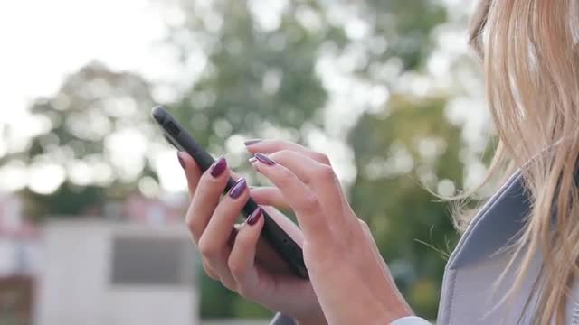 A young lady using a smartphone outdoors. Close-up shot. Soft focus.