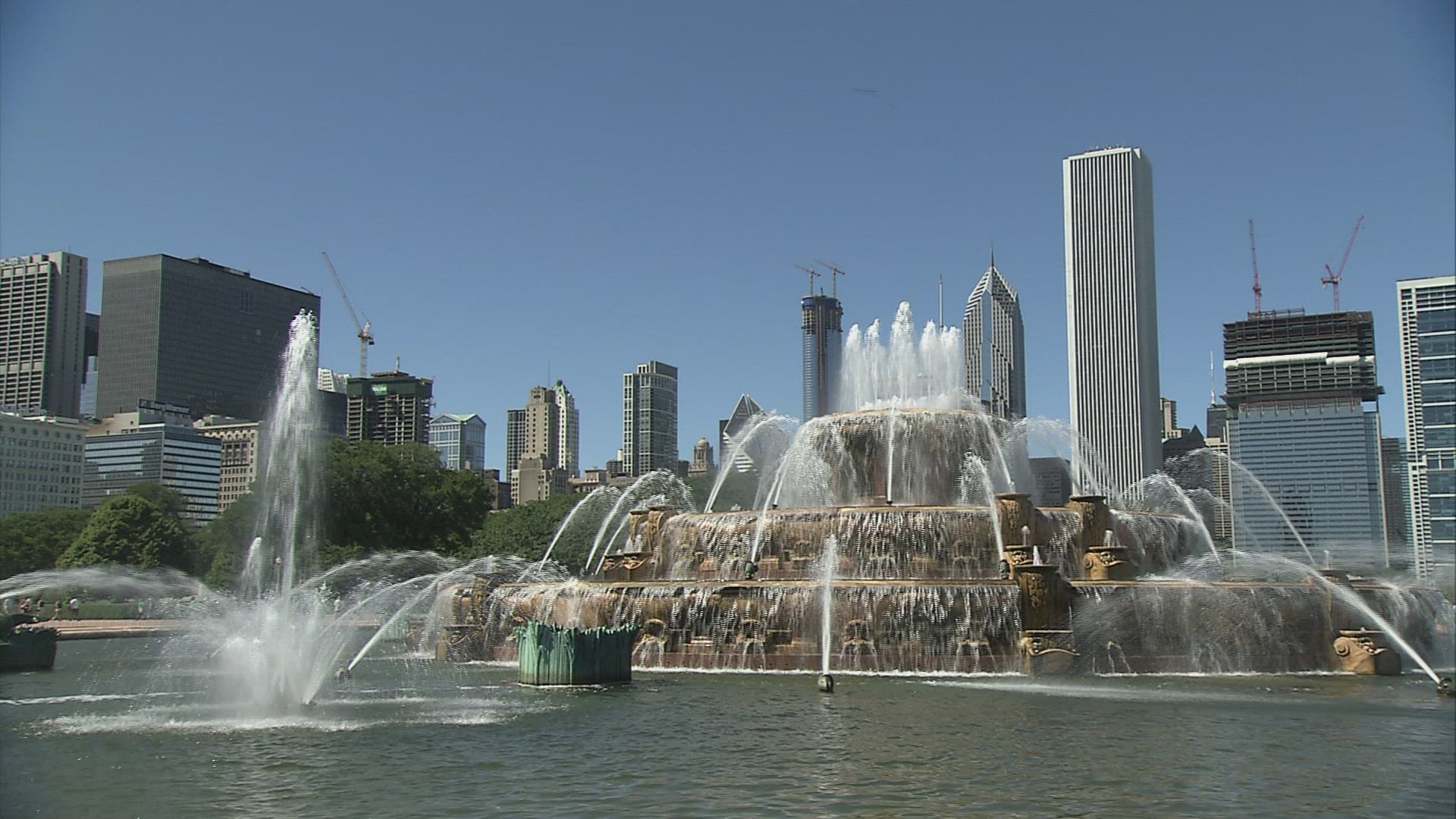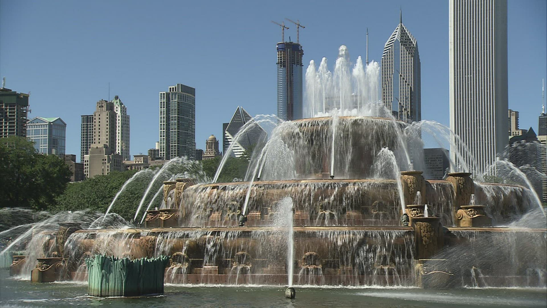 Chicago downtown skyscrapers behind the Buckingham Fountain waters.