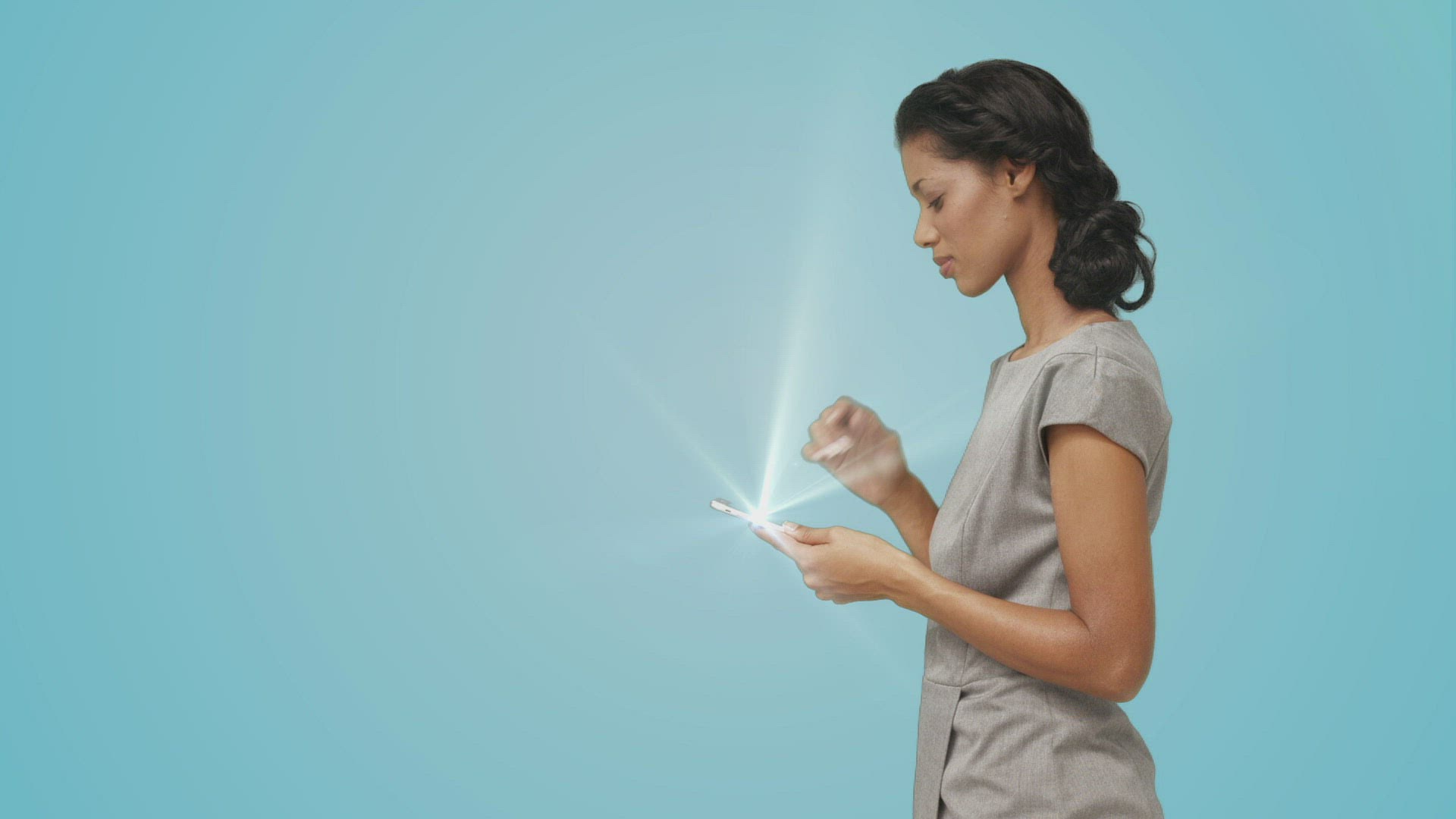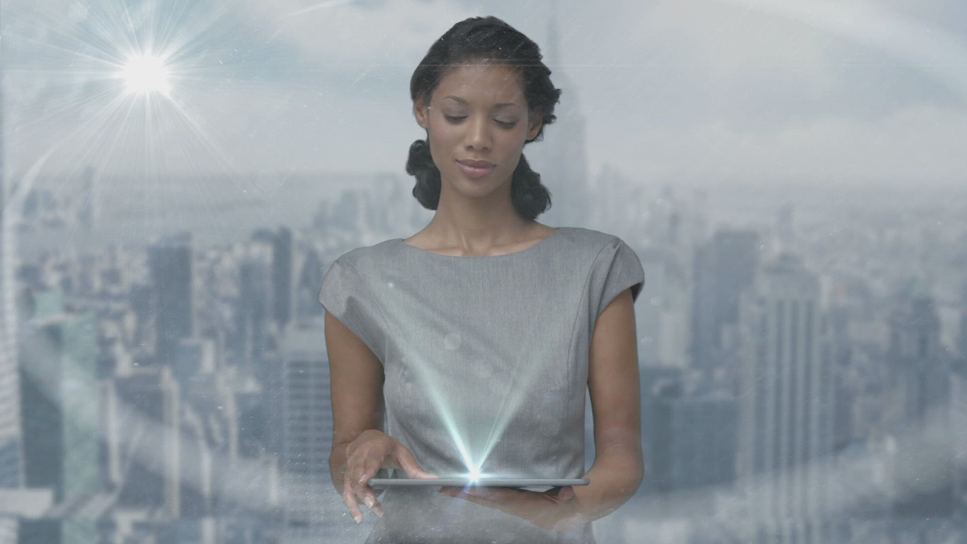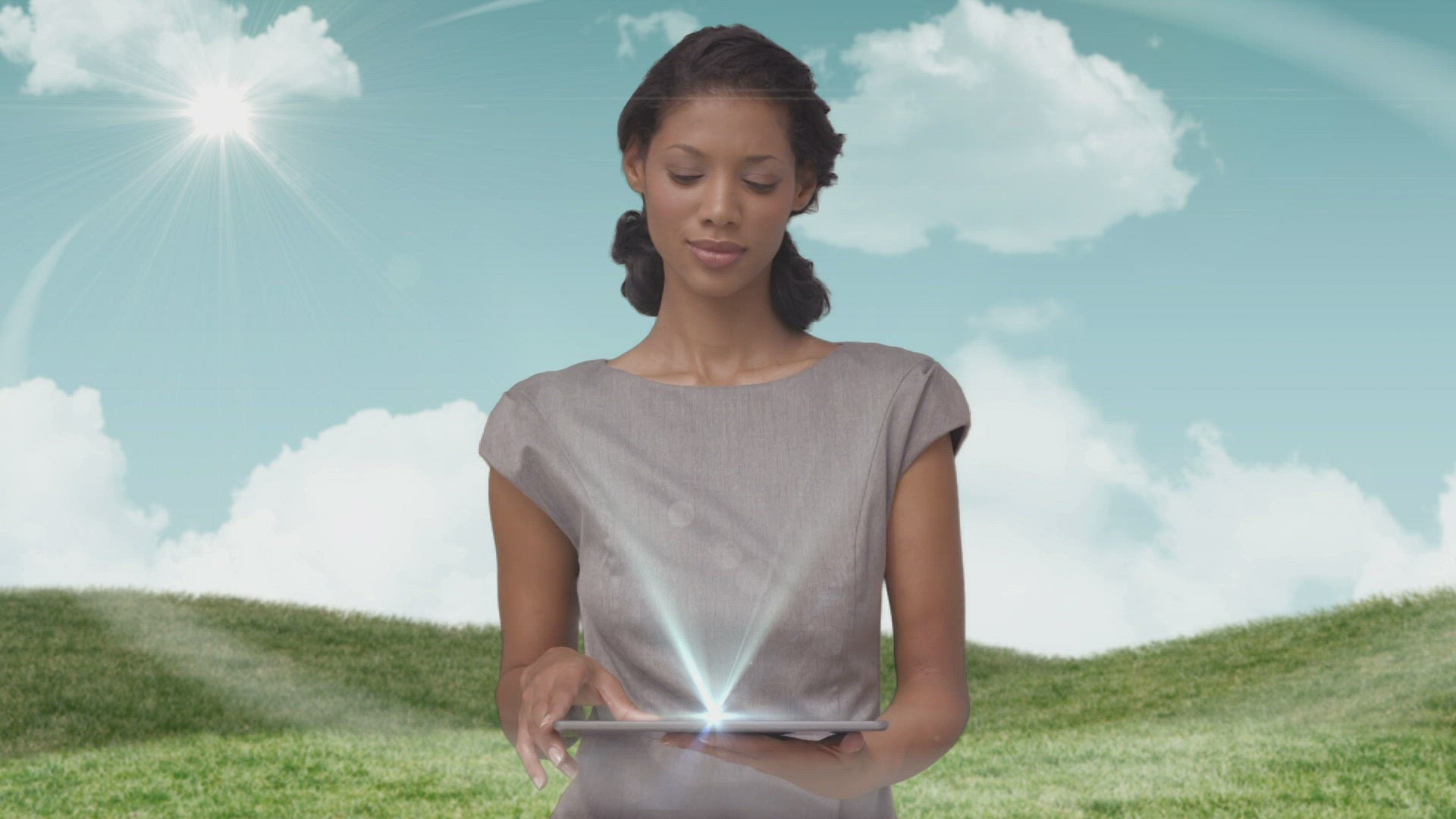 Attractive millennial woman making a decision on buying something with her digital tablet online with a credit card - hand held