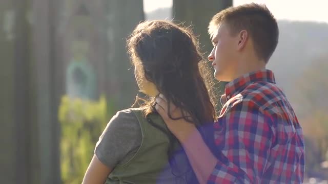Woman leading a man through their new house and they hug and kiss