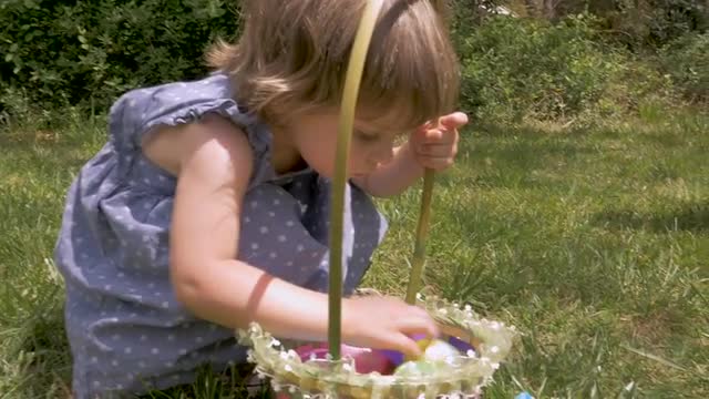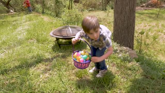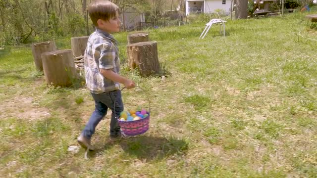 Cute young boy 4 - 5 years old holding an Easter basket walks towards his mother holding a white basket in slow motion