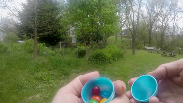 Boy holding an Easter basket walks towards his mother holding a white basket