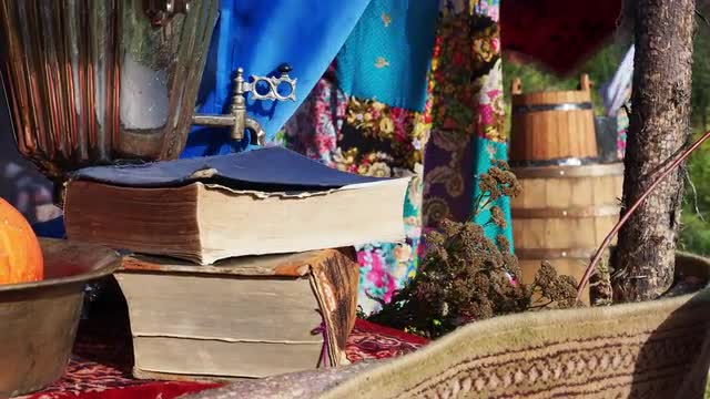 Books and the samovar standing on the table