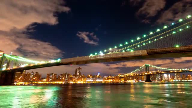 > Brooklyn and Manhattan Bridge and the New York City skyline time lapse. Cropped.