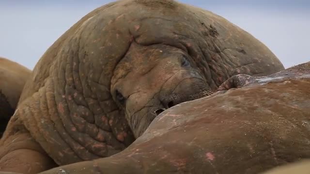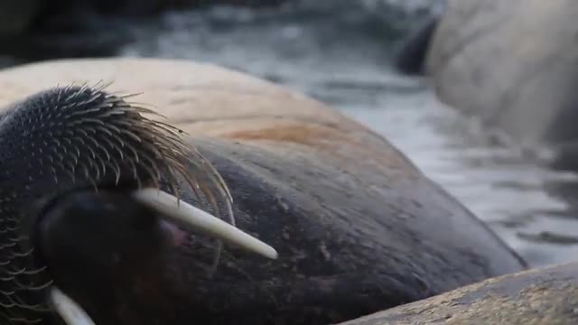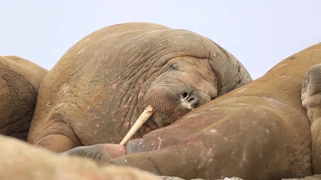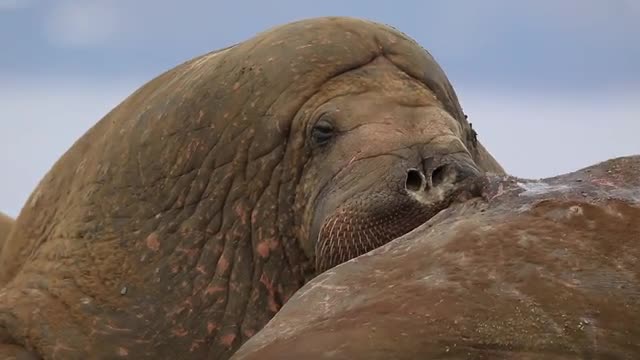 946014 - Walrus (Odobenus rosmarus), close adult portrait in group nuzzling another, Antarctica