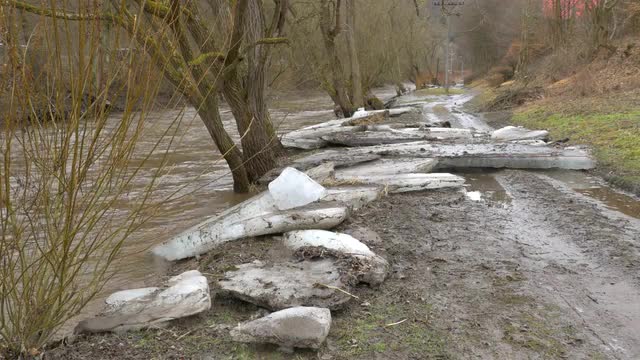 > Big chunks of ice washed up on road