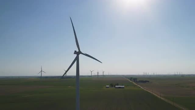 Zoom out of wind turbines in sunny field