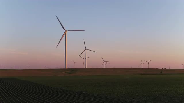 Zoom in on wind farm at sunset