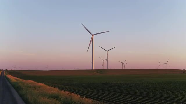 > Driving on road near wind farm at sunset