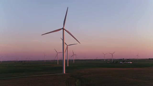 Zoom in on wind farm at sunset