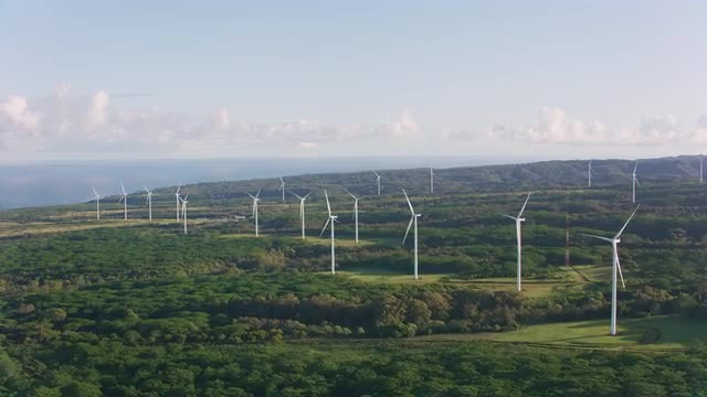 Panning shot of wind turbines at sunset