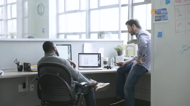 > Businessmen talking near laptop in startup office