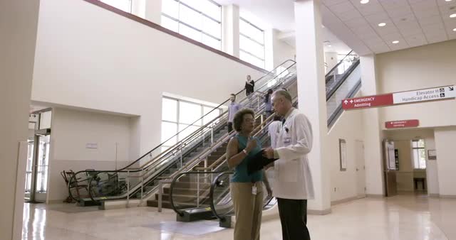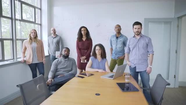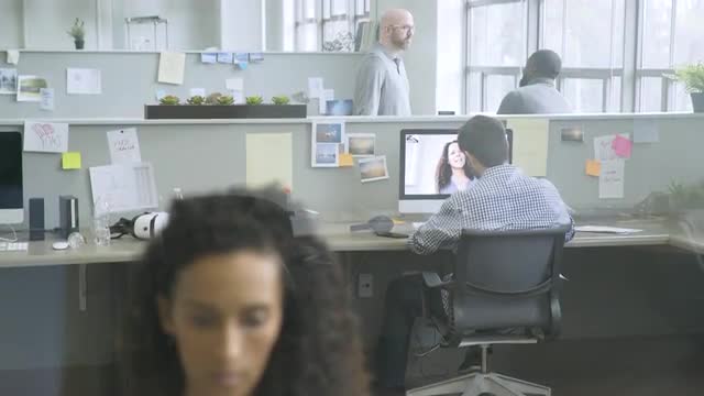 > Businessman video chatting with businesswoman in startup office