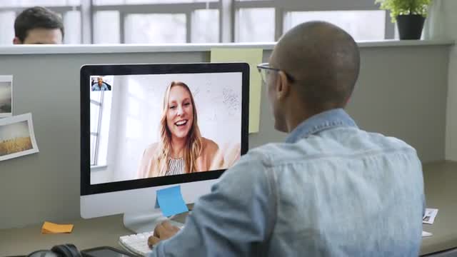925904 - Businessman and businesswoman finishing video chat