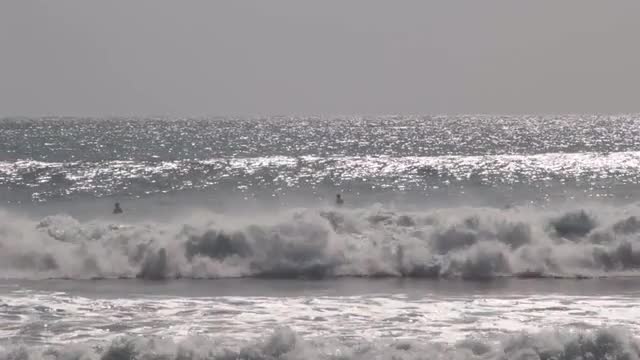 > Flyover of people on beach, Sayulita, Jalisco, Mexico