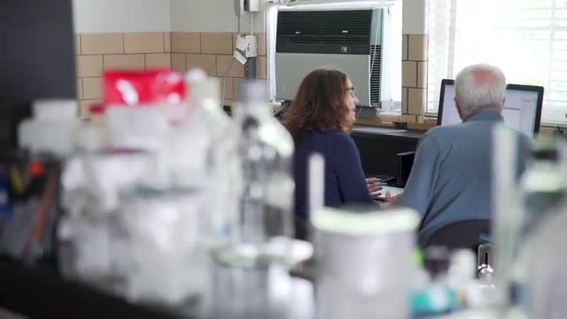 > Look through lab equipment at man and woman sitting at lab computer, wide slide