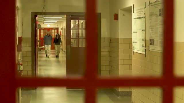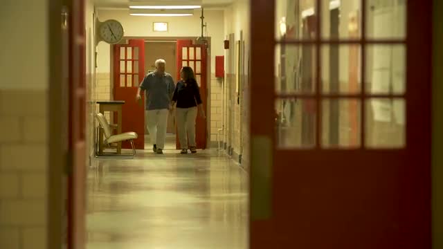 926684 - Man and woman walk up hallway, view through doors