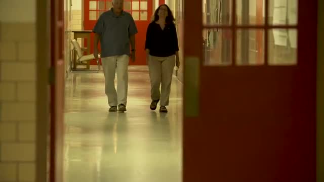 926610 - Man and woman walk and talk down hallway, rear pan