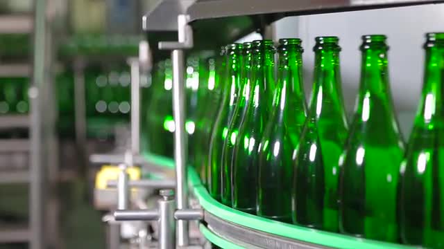 Clean bottles move along the conveyor to fill them with champagne at the factory of champagne wines, close-up. Bottle of champagne at factory. Production of champagne.