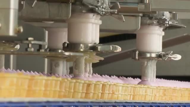 Ice cream factory. Filling of wafer cups with ice cream. Pink fruity and vanilla ice cream in a waffle cup. Automated production of ice cream.