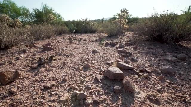 > Right slide over rocks on desert ground, high speed 60