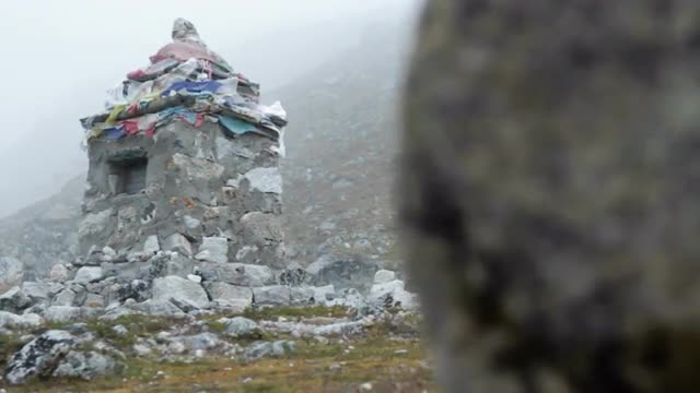 > A mountain of stones. Prayer flags. Tibet