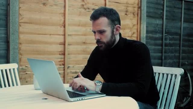 Handsome young man talking phone and using laptop computer sitting in the kitchen after breakfast in the morning at home