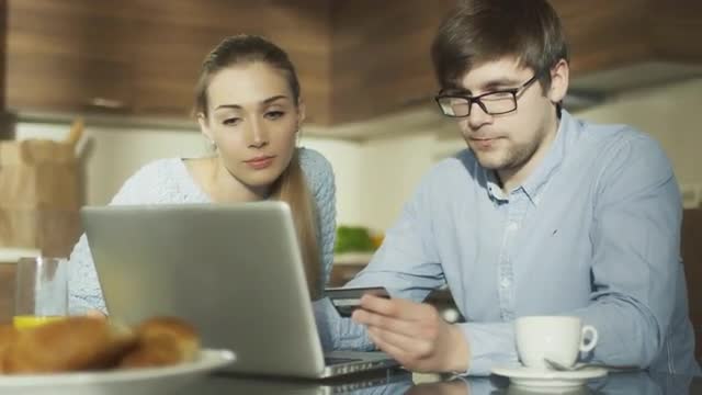 > Smiling woman doing online shopping using smartphone and credit card while have breakfast in the kit