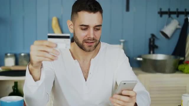 Smiling woman doing online shopping using smartphone and credit card while have breakfast in the kit